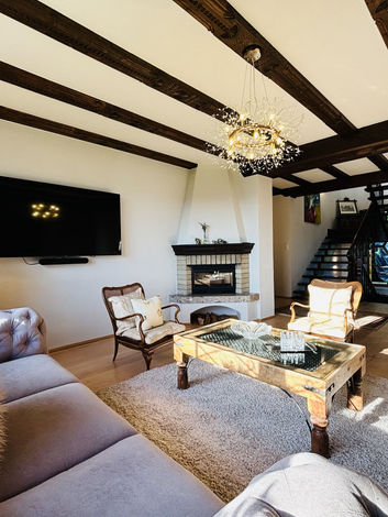 Im Salon / 1. Wohnzimmer finden Sie eine gemütliche Sitzgruppe, einen 65"-Smart-TV samt WLAN-Soundbar (als reiner Musikplayer verwendbar) sowie einen beheizbaren Kamin (Holz vorhanden).