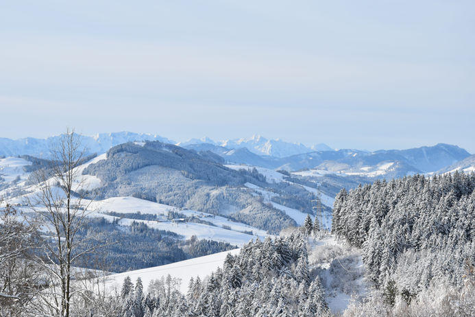 In der 2024 neu errichteten Gaupe befindet sich unser 2. Badezimmer mit Rainforest-Dusche, Waschbecken, WC und Handtuchtrockner. Der Blick öffnet sich über die Hausrückseite in Richtung Ötscher.